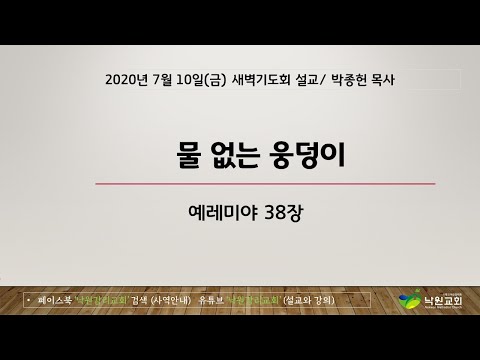 일시: 2020년 7월 10일(금) 새벽기도회 제목: 물없는 웅덩이 본문: 예레미야 38장 예레미야 38장 1.맛단의 아들 스바댜와 바스훌의 아들 그다랴와 셀레먀의 아들 유갈과 말기야의 아들 바스훌이 예레미야가 모든 백성에게 이르는 말을 들은즉 이르기를 2.여호와께서 이와 같이 말씀하시되 이 성에 머무는 자는 칼과 기근과 전염병에 죽으리라 그러나 갈대아인에게 항복하는 자는 살리니 그는 노략물을 얻음 같이 자기의 목숨을 건지리라 3.여호와께서 이와 같이 말씀하시니라 이 성이 반드시 바벨론의 왕의 군대의 손에 넘어가리니 그가 차지하리라 하셨다 하는지라 4.이에 그 고관들이 왕께 아뢰되 이 사람이 백성의 평안을 구하지 아니하고 재난을 구하오니 청하건대 이 사람을 죽이소서 그가 이같이 말하여 이 성에 남은 군사의 손과 모든 백성의 손을 약하게 하나이다 5.시드기야 왕이 이르되 보라 그가 너희 손 안에 있느니라 왕은 조금도 너희를 거스를 수 없느니라 하는지라 6.그들이 예레미야를 끌어다가 감옥 뜰에 있는 왕의 아들 말기야의 구덩이에 던져 넣을 때에 예레미야를 줄로 달아내렸는데 그 구덩이에는 물이 없고 진창뿐이므로 예레미야가 진창 속에 빠졌더라 7.왕궁 내시 구스인 에벳멜렉이 그들이 예레미야를 구덩이에 던져 넣었음을 들으니라 그 때에 왕이 베냐민 문에 앉았더니 8.에벳멜렉이 왕궁에서 나와 왕께 아뢰어 이르되 9.내 주 왕이여 저 사람들이 선지자 예레미야에게 행한 모든 일은 악하니이다 성 중에 떡이 떨어졌거늘 그들이 그를 구덩이에 던져 넣었으니 그가 거기에서 굶어 죽으리이다 하니 10.왕이 구스 사람 에벳멜렉에게 명령하여 이르되 너는 여기서 삼십 명을 데리고 가서 선지자 예레미야가 죽기 전에 그를 구덩이에서 끌어내라 11.에벳멜렉이 사람들을 데리고 왕궁 곳간 밑 방에 들어가서 거기에서 헝겊과 낡은 옷을 가져다가 그것을 구덩이에 있는 예레미야에게 밧줄로 내리며 12.구스인 에벳멜렉이 예레미야에게 이르되 당신은 이 헝겊과 낡은 옷을 당신의 겨드랑이에 대고 줄을 그 아래에 대시오 예레미야가 그대로 하매 13.그들이 줄로 예레미야를 구덩이에서 끌어낸지라 예레미야가 시위대 뜰에 머무니라 14.시드기야 왕이 사람을 보내어 선지자 예레미야를 여호와의 성전 셋째 문으로 데려오게 하고 왕이 예레미야에게 이르되 내가 네게 한 가지 일을 물으리니 한 마디도 내게 숨기지 말라 15.예레미야가 시드기야에게 이르되 내가 이 일을 왕에게 아시게 하여도 왕이 결코 나를 죽이지 아니하시리이까 가령 내가 왕을 권한다 할지라도 왕이 듣지 아니하시리이다 16.시드기야 왕이 비밀히 예레미야에게 맹세하여 이르되 우리에게 이 영혼을 지으신 여호와께서 살아 계심을 두고 맹세하노니 내가 너를 죽이지도 아니하겠으며 네 생명을 찾는 그 사람들의 손에 넘기지도 아니하리라 하는지라 17.예레미야가 시드기야에게 이르되 만군의 하나님이신 이스라엘의 하나님 여호와께서 이와 같이 말씀하시되 네가 만일 바벨론의 왕의 고관들에게 항복하면 네 생명이 살겠고 이 성이 불사름을 당하지 아니하겠고 너와 네 가족이 살려니와 18.네가 만일 나가서 바벨론의 왕의 고관들에게 항복하지 아니하면 이 성이 갈대아인의 손에 넘어가리니 그들이 이 성을 불사를 것이며 너는 그들의 손을 벗어나지 못하리라 하셨나이다 19.시드기야 왕이 예레미야에게 이르되 나는 갈대아인에게 항복한 유다인을 두려워하노라 염려하건대 갈대아인이 나를 그들의 손에 넘기면 그들이 나를 조롱할까 하노라 하는지라 20.예레미야가 이르되 그 무리가 왕을 그들에게 넘기지 아니하리이다 원하옵나니 내가 왕에게 아뢴 바 여호와의 목소리에 순종하소서 그리하면 왕이 복을 받아 생명을 보전하시리이다 21.그러나 만일 항복하기를 거절하시면 여호와께서 내게 보이신 말씀대로 되리이다 22.보라 곧 유다 왕궁에 남아 있는 모든 여자가 바벨론 왕의 고관들에게로 끌려갈 것이요 그 여자들은 네게 말하기를 네 친구들이 너를 꾀어 이기고 네 발이 진흙에 빠짐을 보고 물러갔도다 하리라 23.네 아내들과 자녀는 갈대아인에게로 끌려가겠고 너는 그들의 손에서 벗어나지 못하고 바벨론 왕의 손에 잡히리라 또 네가 이 성읍으로 불사름을 당하게 하리라 하셨나이다 24.시드기야가 예레미야에게 이르되 너는 이 말을 어느 사람에게도 알리지 말라 그리하면 네가 죽지 아니하리라 25.만일 고관들이 내가 너와 말하였다 함을 듣고 와서 네게 말하기를 네가 왕에게 말씀한 것을 우리에게 전하라 우리에게 숨기지 말라 그리하면 우리가 너를 죽이지 아니하리라 또 왕이 네게 말씀한 것을 전하라 하거든 26.그들에게 대답하되 내가 왕 앞에 간구하기를 나를 요나단의 집으로 되돌려 보내지 마소서 그리하여 거기서 죽지 않게 하옵소서 하였다 하라 하니라 27.모든 고관이 예레미야에게 와서 물으매 그가 왕이 명령한 모든 말대로 대답하였으므로 일이 탄로되지 아니하였고 그들은 그와 더불어 말하기를 그쳤더라 28.예레미야가 예루살렘이 함락되는 날까지 감옥 뜰에 머물렀더라