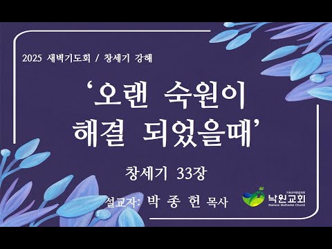 일시 : 25/12/12제목 : ‘오랜 숙원이 해결되었을 때 .’본문 : 창세기 33장말씀선포 : 박종헌 담임목사1 야곱이 눈을 들어 보니 에서가 사백 명의 장정을 거느리고 오고 있는지라 그의 자식들을 나누어 레아와…