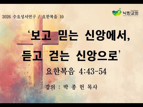 일시 : 26/04/15제목 : 보고 믿는 신앙에서, 듣고 걷는 신앙으로"본문 : 요한복음 4:43-54말씀선포 : 박종헌 담임목사43 이틀이 지나매 예수께서 거기를 떠나 갈릴리로 가시며44 친히 증언하시기를 선지자…