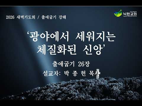 일시 : 26/04/15제목 : 광야에서 세워지는 체질화된 신앙본문 : 출애굽기 26장말씀선포 : 박종헌 담임목사1 너는 성막을 만들되 가늘게 꼰 베 실과 청색 자색 홍색 실로 그룹을 정교하게 수 놓은 열 폭의 휘장…