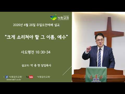 일시 : 26/4/26제목 : 크게 소리쳐야 할 그 이름, 예수본문 : 행 16:30-34말씀선포 : 박종헌 담임목사30 그들을 데리고 나가 이르되 선생들이여 내가 어떻게 하여야 구원을 받으리이까 하거늘31 이르되 …